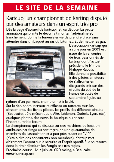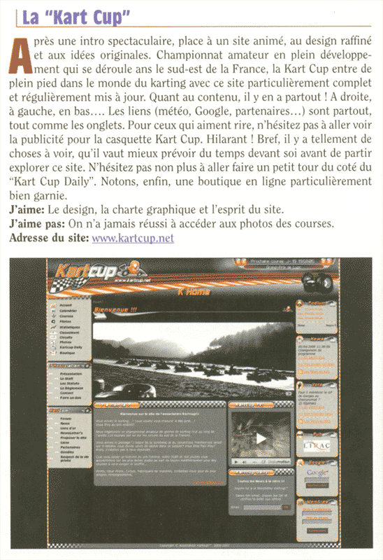 Dans la rubrique "PRATIQUE : Les sites internet au banc d'essai", La KartCup s'illustre avec une très bonne appréciation avec des commentaires proche des 16000 tours minute.